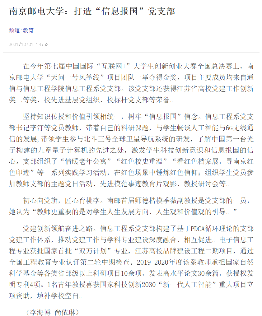 | 【新華日?qǐng)?bào)客戶端】南京郵電大學(xué):打造“信息報(bào)國(guó)”黨支部 |