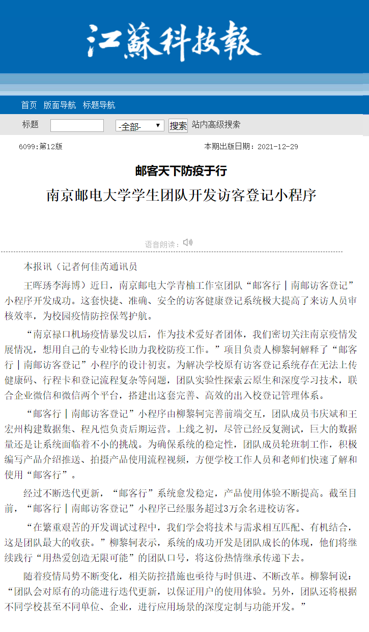 | 【江蘇科技報】郵客天下防疫于行 南京郵電大學學生團隊開發訪客登記小程序 |