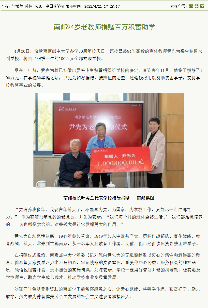 | 【科學(xué)網(wǎng)】南郵94歲老教師捐贈(zèng)百萬積蓄助學(xué) |