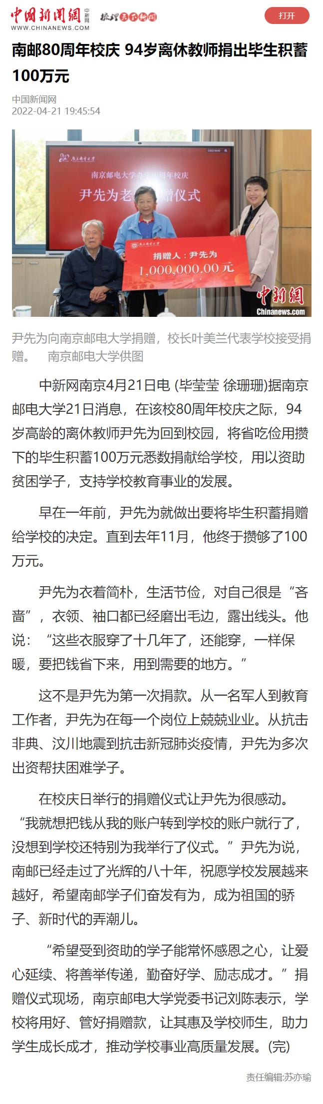 | 【中國(guó)新聞網(wǎng)】南郵80周年校慶 94歲離休教師捐出畢生積蓄100萬(wàn)元 |