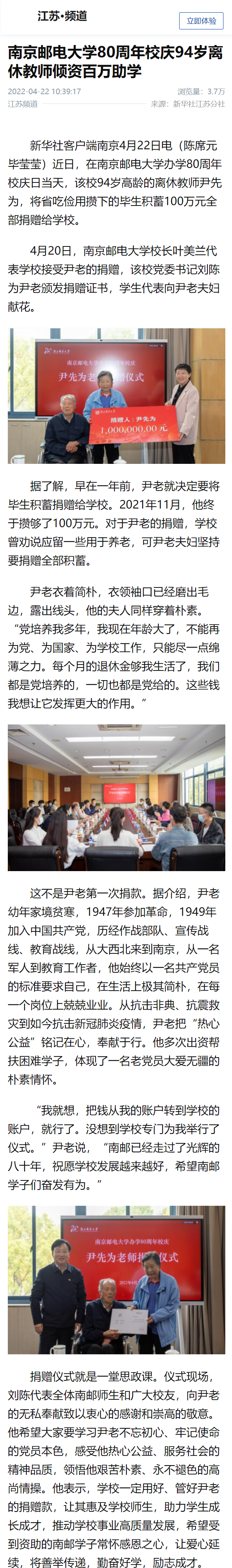| 【新華社江蘇頻道】南京郵電大學80周年校慶94歲離休教師傾資百萬助學 |