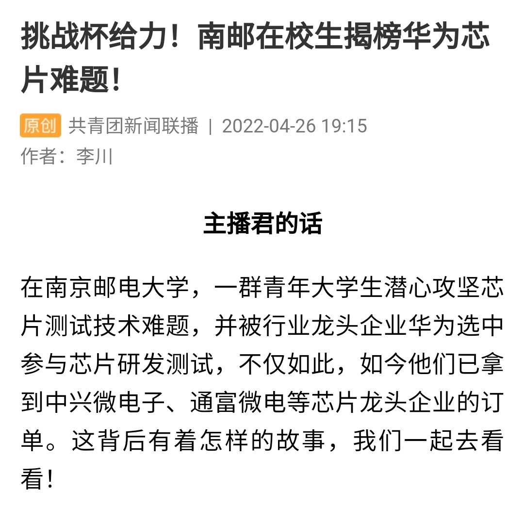 | 【共青團新聞聯播】挑戰(zhàn)杯給力!南郵在校生揭榜華為芯片難題! |