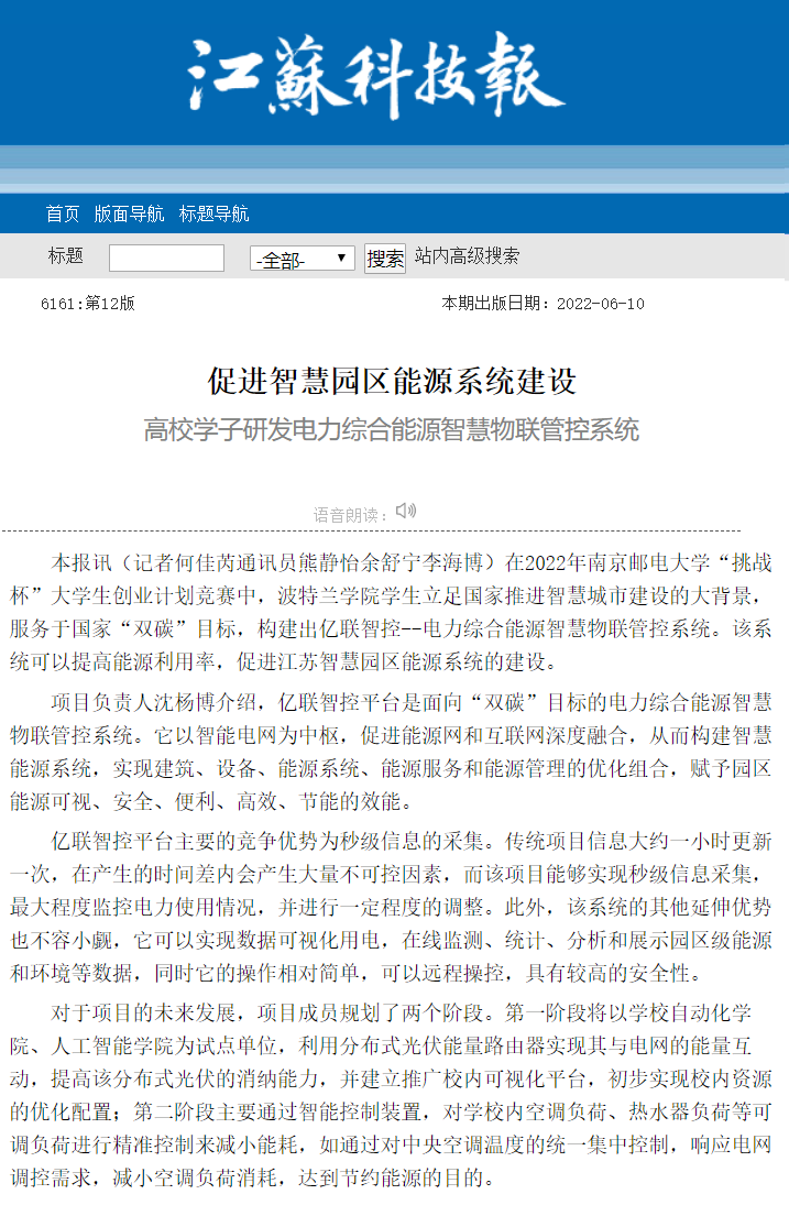 | 【江蘇科技報】高校學子研發電力綜合能源智慧物聯管控系統 |