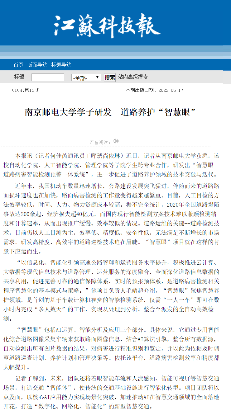 | 【江蘇科技報】南京郵電大學(xué)學(xué)子研發(fā) 道路養(yǎng)護(hù)“智慧眼” |