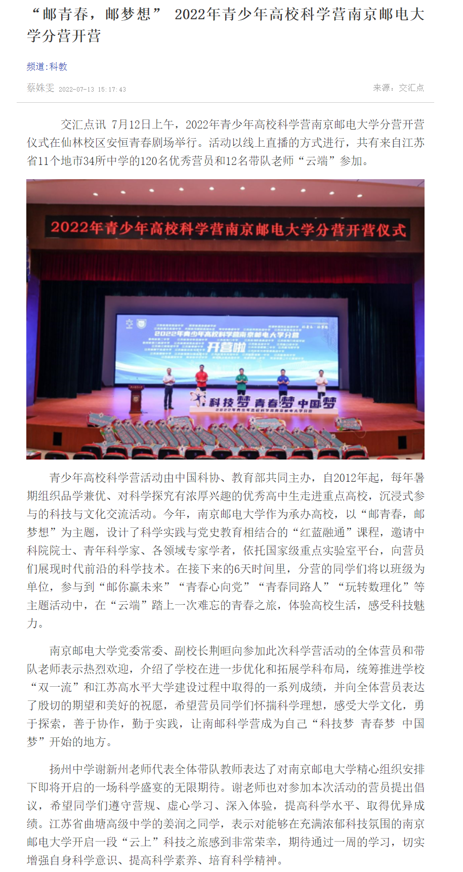| 【新華日報客戶端】“郵青春,郵夢想” 2022年青少年高校科學營南京郵電大學分營開營 |