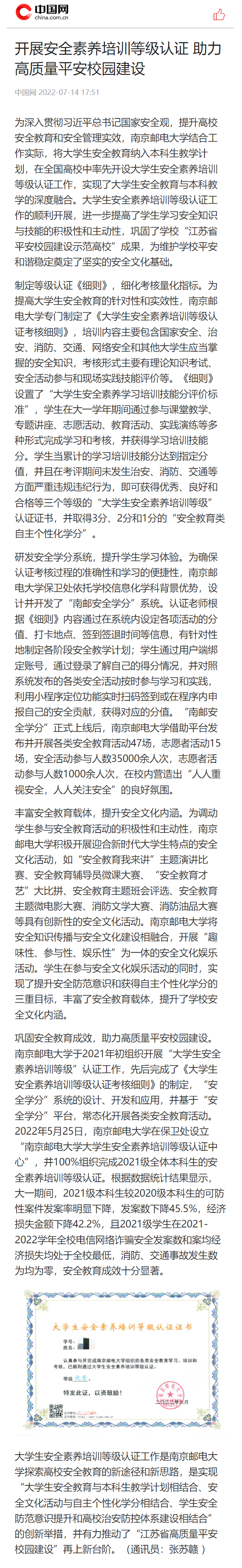 | 【中國(guó)網(wǎng)】開(kāi)展安全素養(yǎng)培訓(xùn)等級(jí)認(rèn)證 助力高質(zhì)量平安校園建設(shè) |