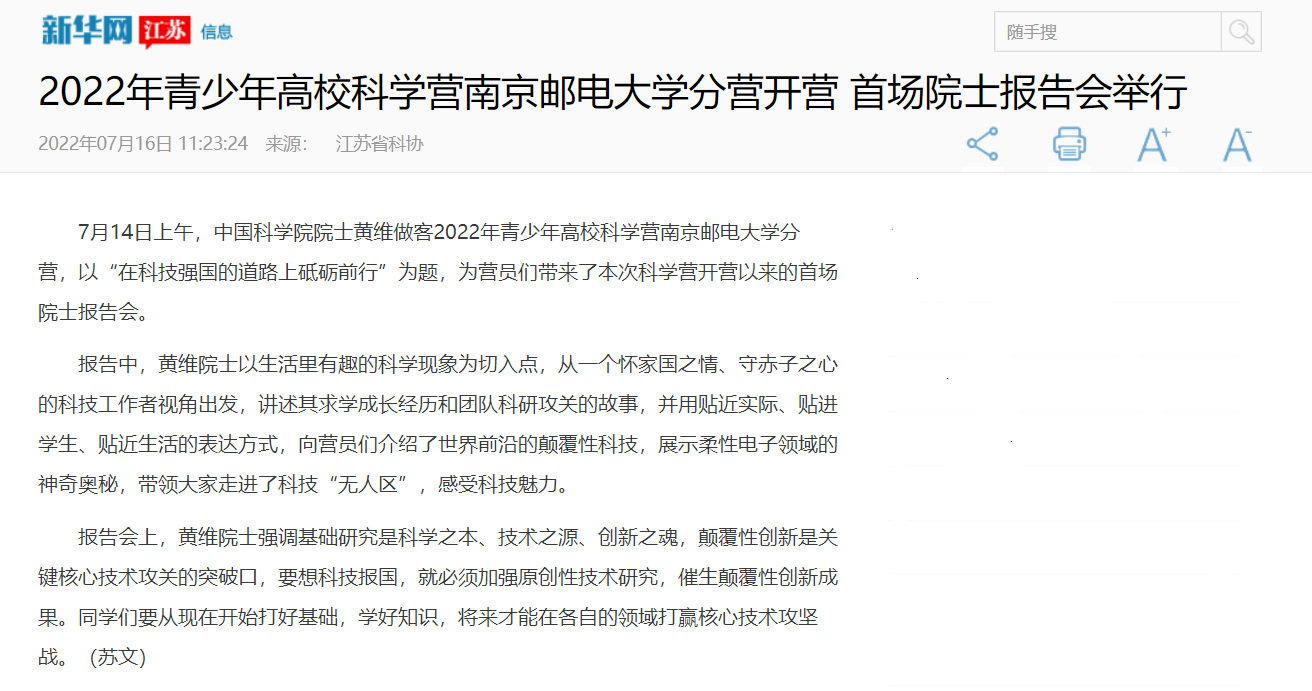 | 【新華網江蘇】2022年青少年高??茖W營南京郵電大學分營開營 首場院士報告會舉行 |