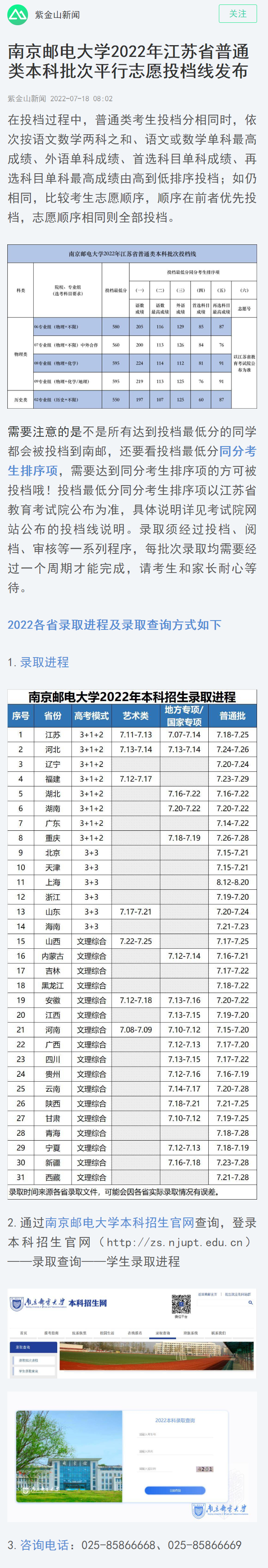 【南京日報客戶端】南京郵電大學2022年江蘇省普通類本科批次平行志愿投檔線發布