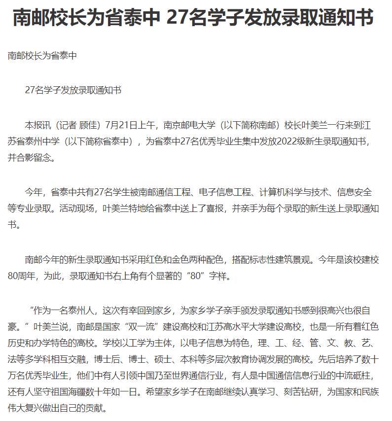 | 【泰州日報】南郵校長為省泰中 27名學(xué)子發(fā)放錄取通知書 |