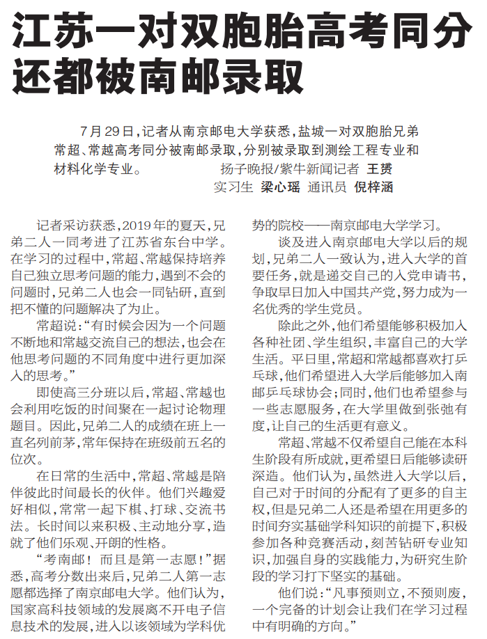 【揚子晚報】江蘇一對雙胞胎高考同分 還都被南郵錄取