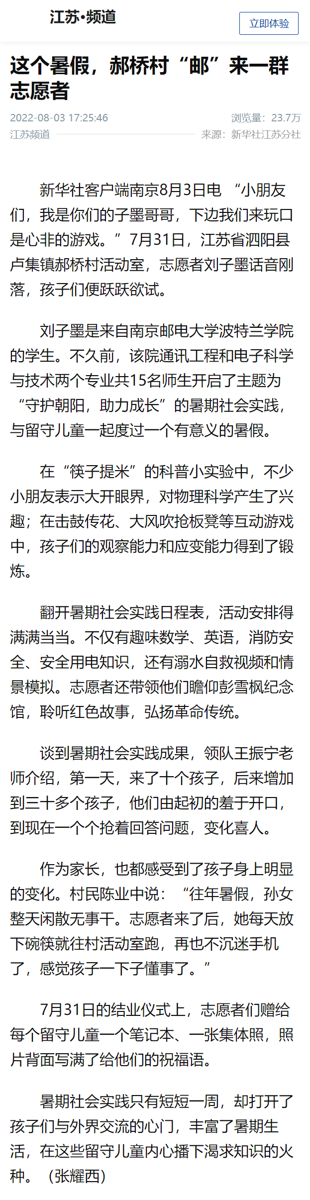 【新華社客戶端】這個暑假,郝橋村“郵”來一群志愿者