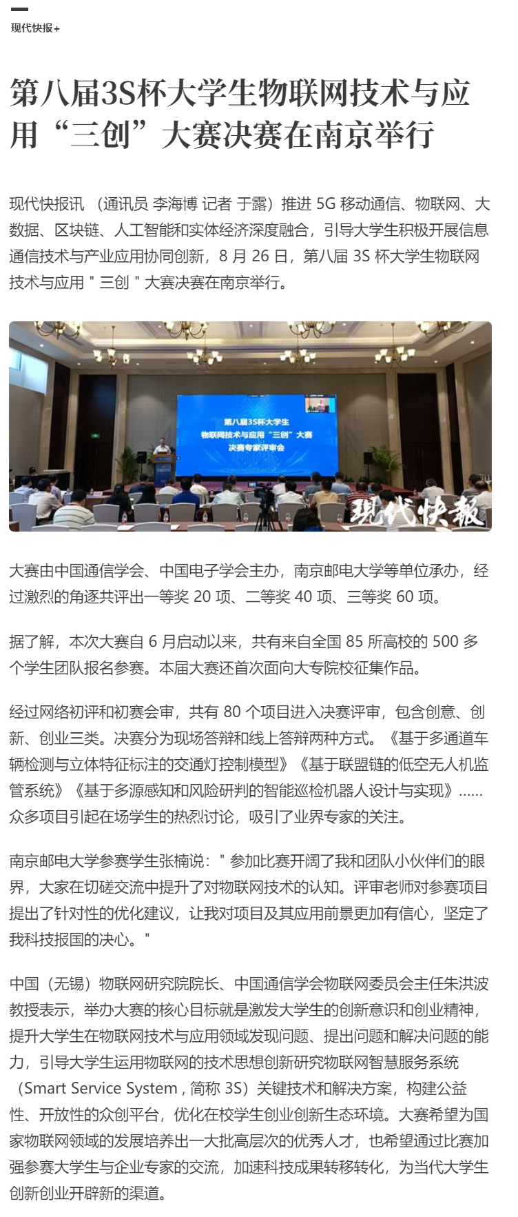 | 【現(xiàn)代快報全媒體】第八屆3S杯大學生物聯(lián)網技術與應用“三創(chuàng)”大賽決賽在南京舉行 |