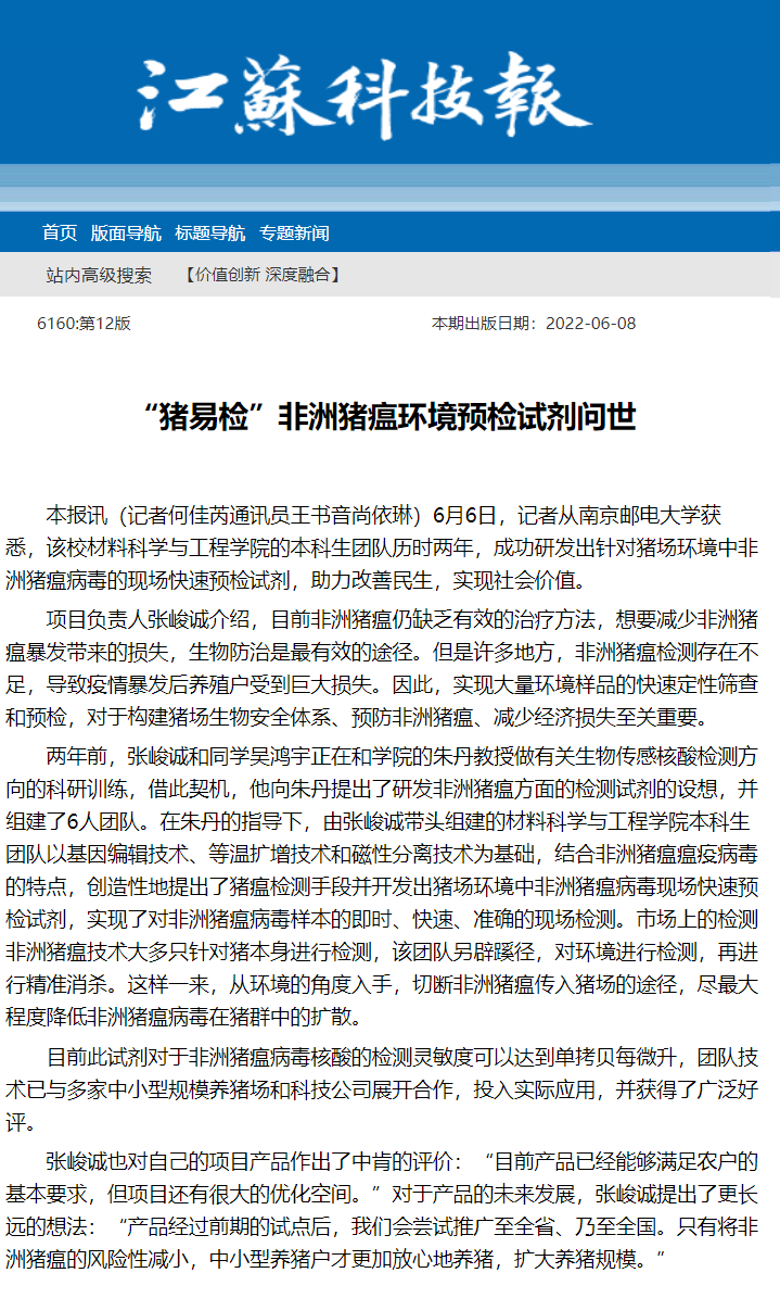 | 【江蘇科技報】“豬易檢”非洲豬瘟環境預檢試劑問世 |