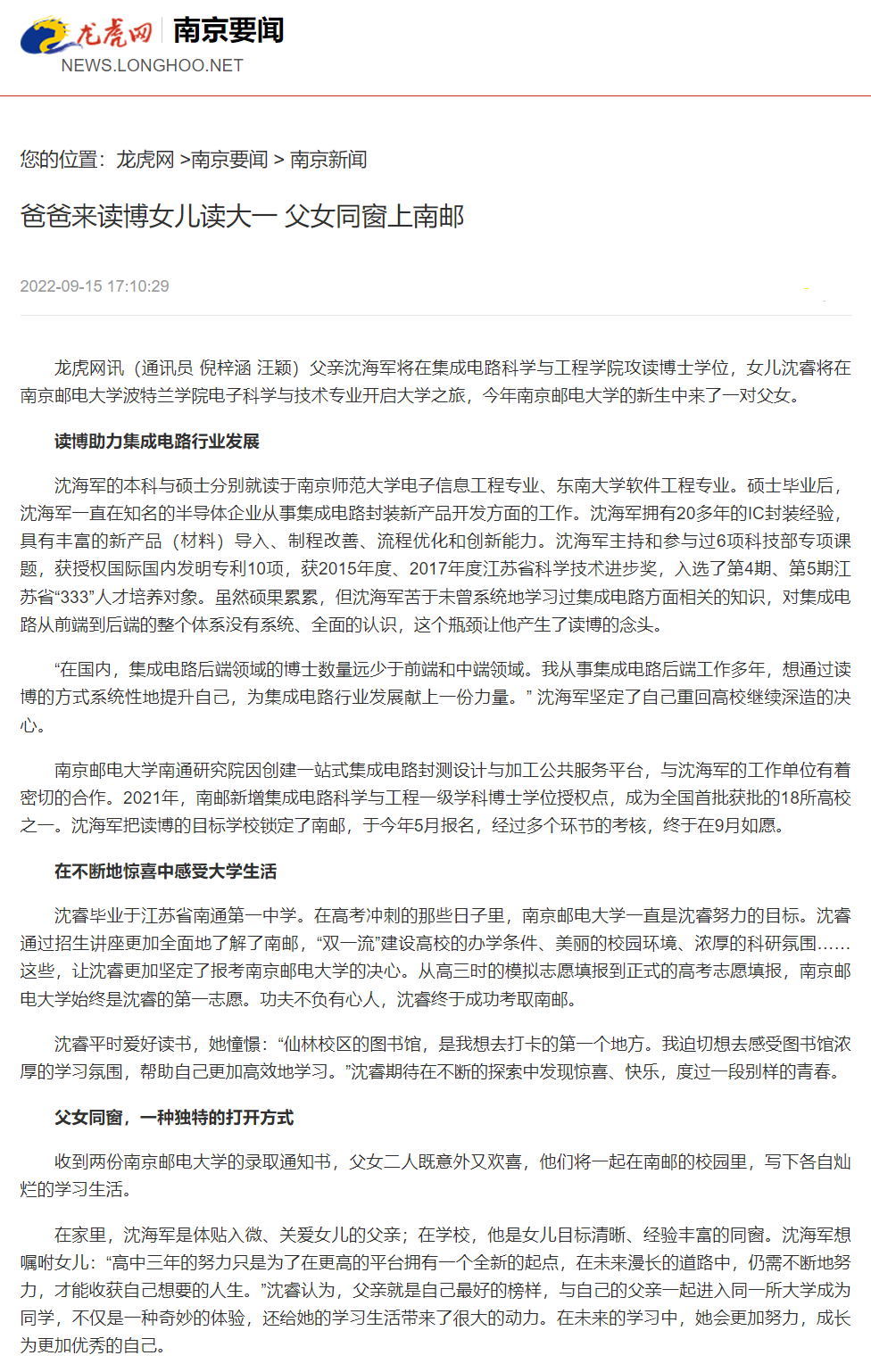 | 【龍虎網】爸爸來讀博女兒讀大一 父女同窗上南郵 |