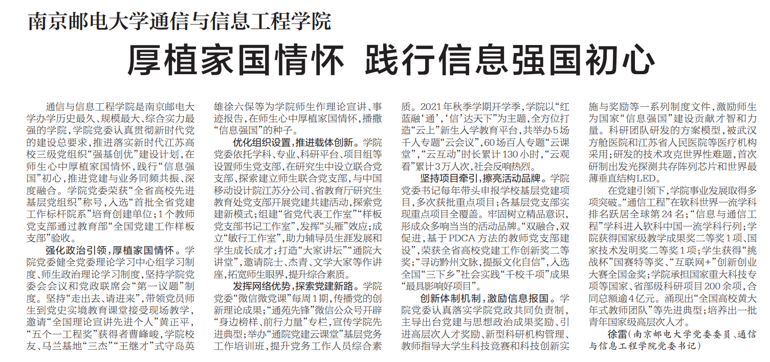 | 【新華日報】南京郵電大學通信與信息工程學院 厚植家國情懷 踐行信息強國初心 |