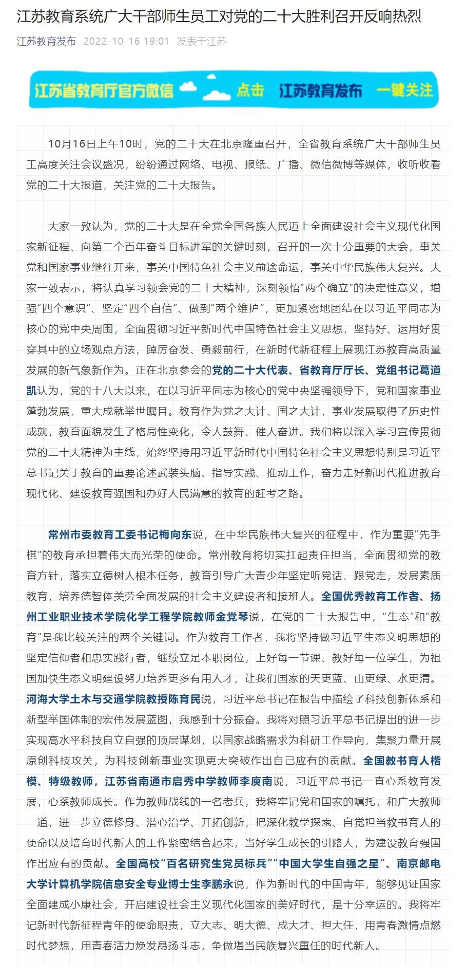| 【江蘇教育發布】江蘇教育系統廣大干部師生員工對黨的二十大勝利召開反響熱烈 |