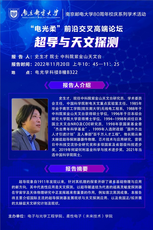 報告題目:超導與天文探測(南京郵電大學80周年校慶系列學術活動) 報告人:史生才院士 報告人單位:中科院紫金山天文臺 時間:2022年11月20日10:45-11:25 地點:仙林校區電光學科樓B幢B322 主辦單位:電子與光學工程學院、柔性電子(未來技術)學院 報告內容:超導現象自1911年發現以來,針對其機理的探索開辟了諸多基礎物理與應用的新方向,其中代表性應用是天文探測。以超導隧道結為代表的超高靈敏度探測器在宇宙學及天體物理研究中正發揮越來愈重要的作用,例如首次黑洞成像。報告將主要介紹國際主流的超導探測器發展現狀與天文探測應用、以及我國正/擬開展的太赫茲天文研究計劃及現狀。 報告人簡介:史生才,中國科學院院士,中科院紫金山天文臺研究員、學術委員會主任,中國科學院射電天文重點實驗室主任。1985年畢業于南京工學院(現東南大學)無線電工程系,1988年于中科院紫金山天文臺獲得碩士學位,1996年于日本綜合研究大學院大學獲得博士學位。1994~1998年間任日本國立天文臺NRO及COE研究員,1998-1999年3次入選國家級高層次人才,2021年當選中國科學院院士。長期從事太赫茲超導探測器器件物理、芯片技術與應用研究,曾獲日中科技交流協會研究獎和多項國家及省部級科技進步獎,2019年何梁何利基金科學與技術進步獎。 |