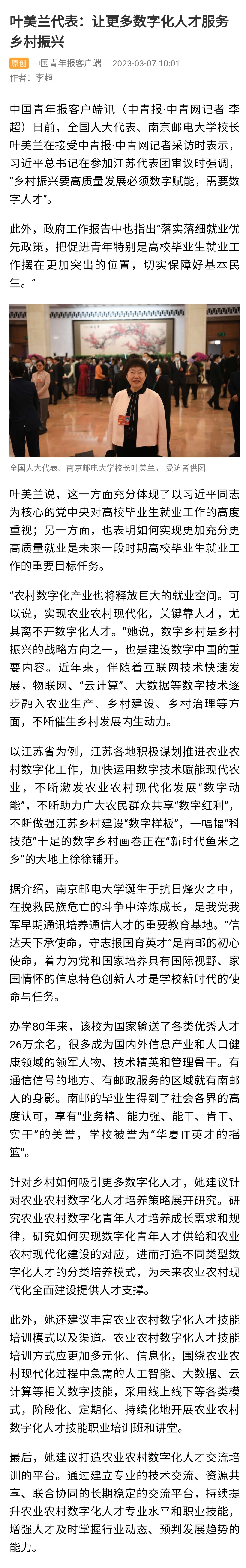 | 【中國青年報客戶端】葉美蘭代表:讓更多數字化人才服務鄉村振興 |