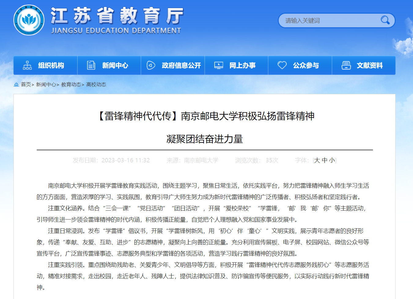 | 【省教育廳官網(wǎng)】南京郵電大學積極弘揚雷鋒精神 凝聚團結(jié)奮進力量 |