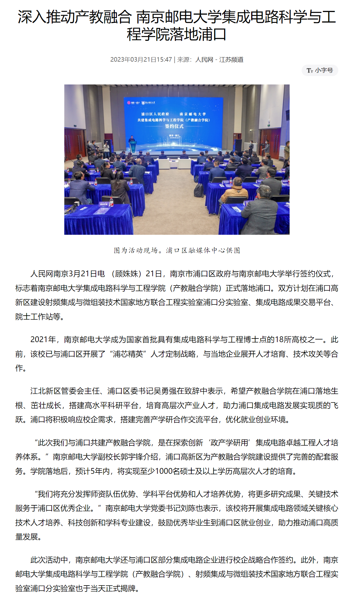 | 【人民網】深入推動產教融合 南京郵電大學集成電路科學與工程學院落地浦口 |