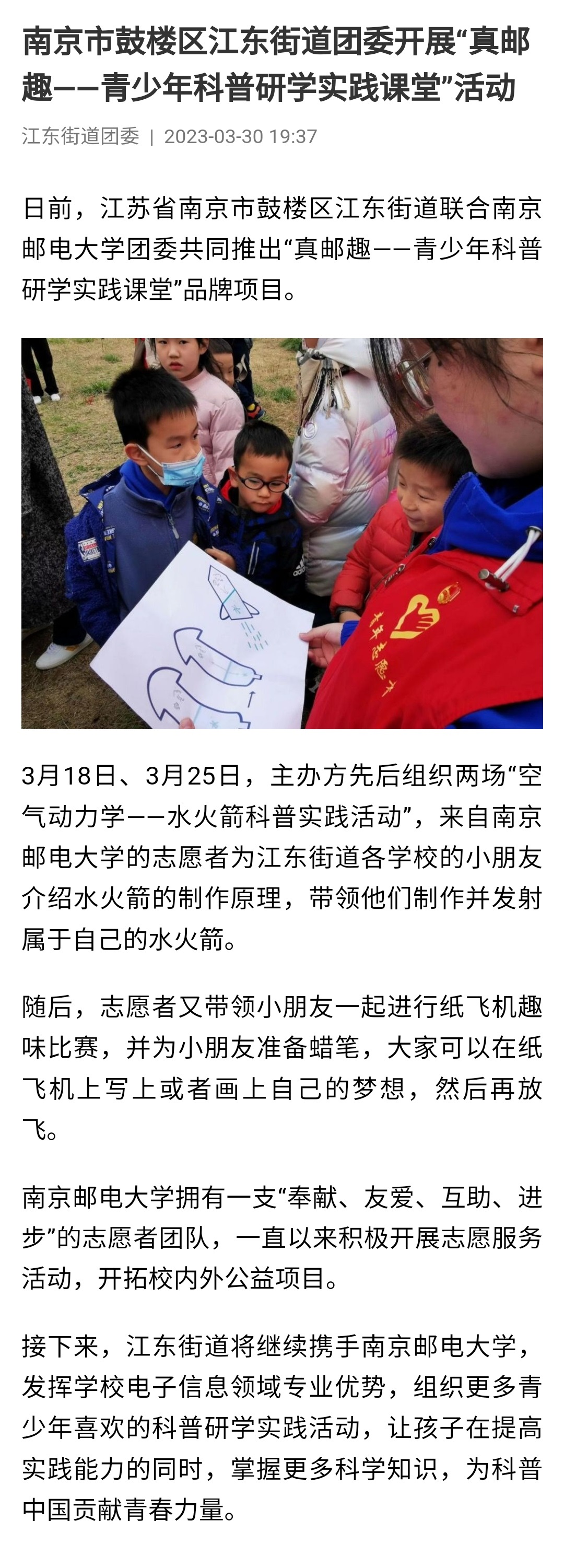 | 【中國青年報客戶端】南京市鼓樓區(qū)江東街道團(tuán)委開展“真郵趣——青少年科普研學(xué)實踐課堂”活動 |