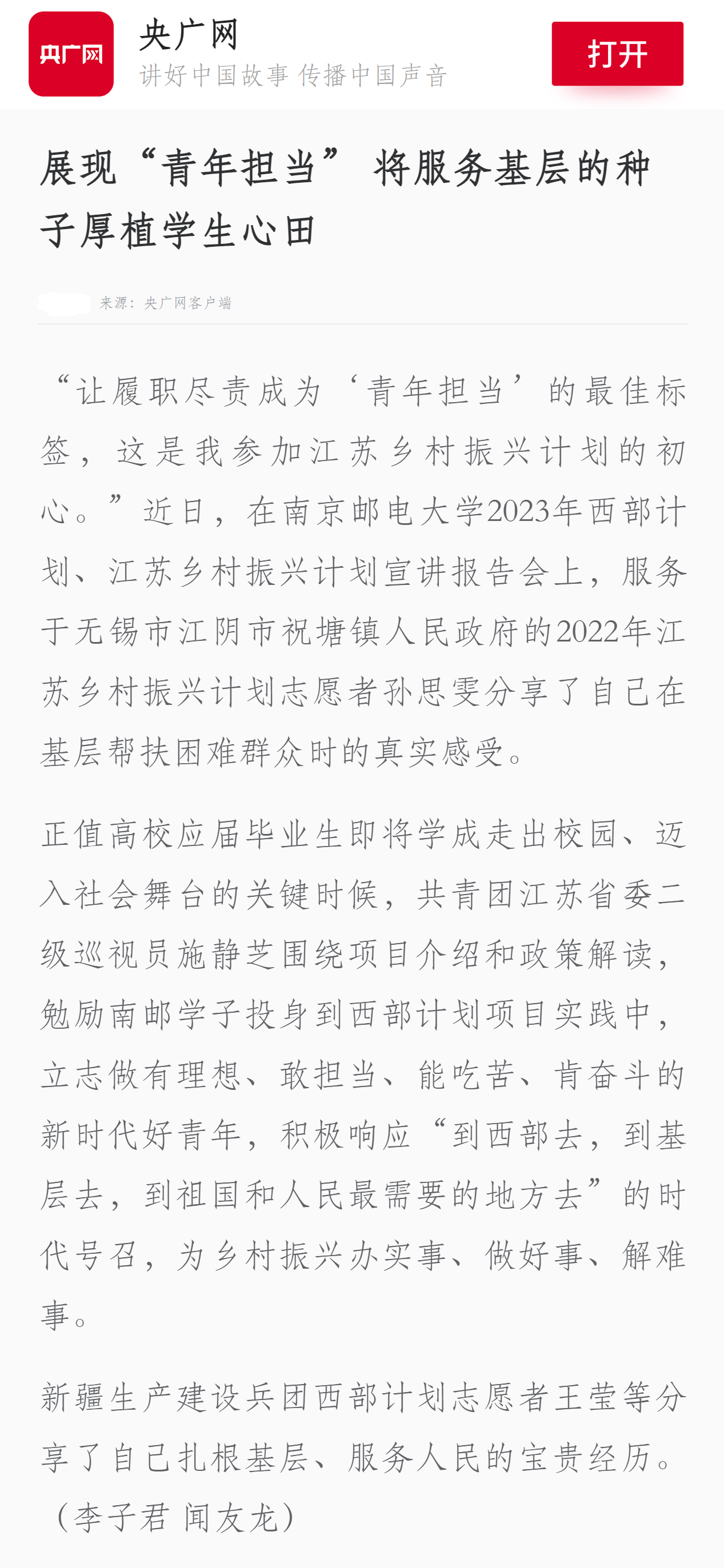 | 【央廣網(wǎng)】展現(xiàn)“青年擔(dān)當(dāng)” 將服務(wù)基層的種子厚植學(xué)生心田 |