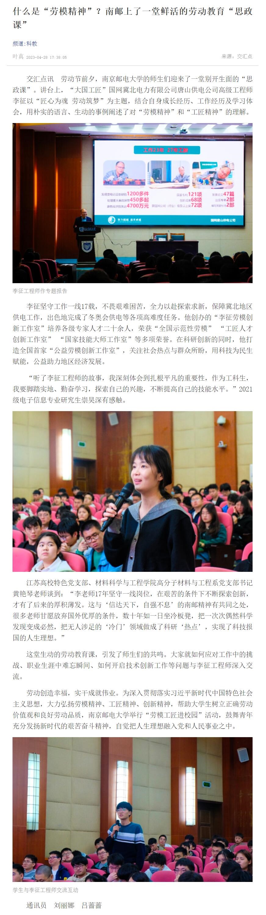 | 【新華日報客戶端】什么是“勞模精神”?南郵上了一堂鮮活的勞動教育“思政課” |