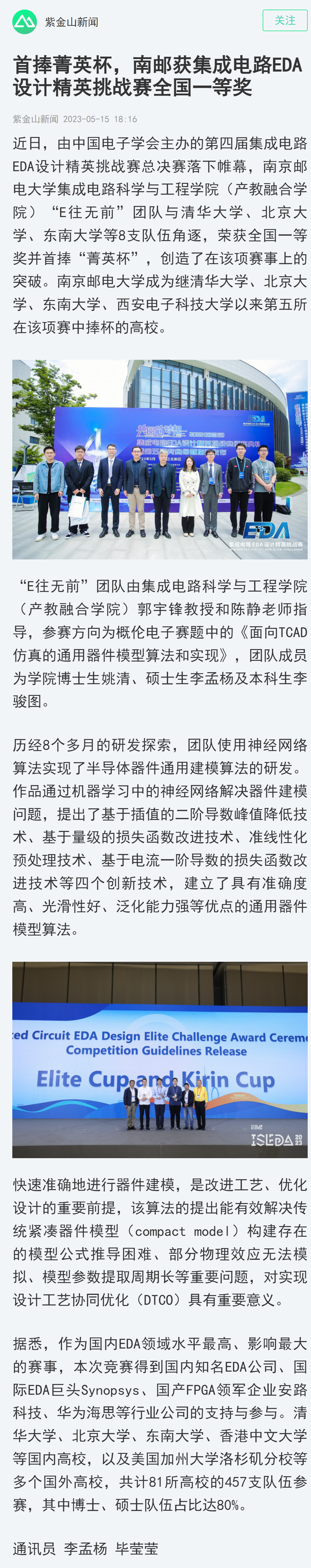 | 【南京日報客戶端】首捧菁英杯,南郵獲集成電路EDA設計精英挑戰賽全國一等獎 |