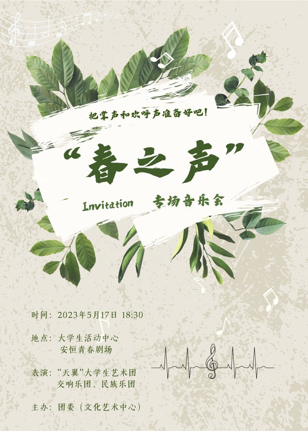 為進一步濃郁校園文化藝術氛圍,提升在校學生的審美情趣和人文素養,團委(文化藝術中心)將于5月17日(周三)18:30在仙林校區青春劇場舉辦 “春之聲”專場音樂會。本場音樂會將由我?!疤煲怼贝髮W生藝術團交響樂團、民族樂團演出。 歡迎廣大師生前來欣賞。 團委(文化藝術中心) 2023年5月15日 |