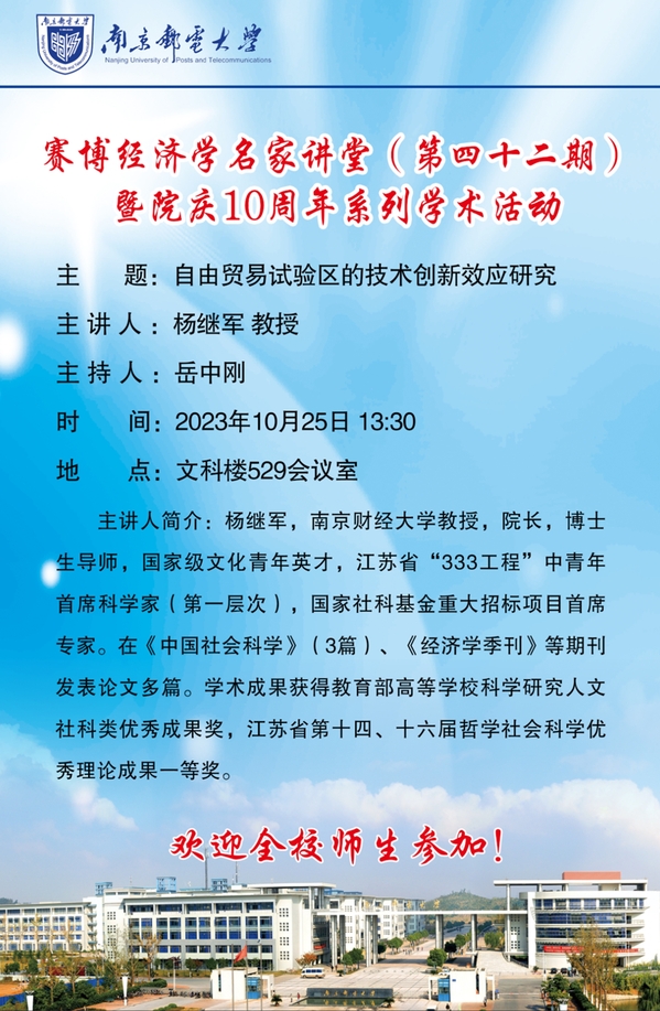 南京財經大學楊繼軍教授學術報告:《自由貿易試驗區的技術創新效應研究》