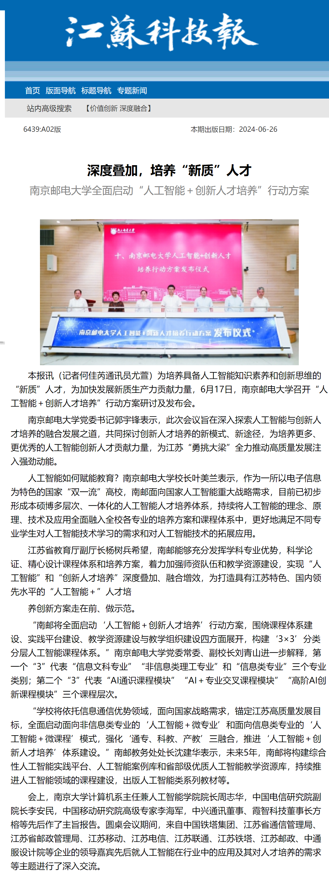 | 【江蘇科技報】南京郵電大學全面啟動“人工智能+創新人才培養”行動方案 |