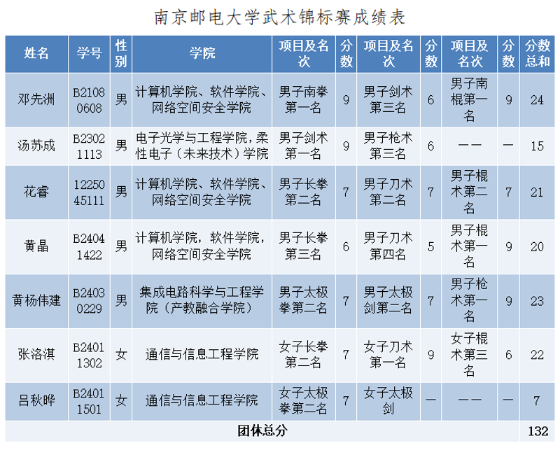 10月11—13日, 2025年江蘇省大學生武術(套路)錦標賽在揚州大學舉行。南京郵電大學武術隊獲甲B組團體總分第一名,收獲6金7銀4銅。 湯蘇成、鄧先洲、黃楊偉建、黃晶、張洛淇同學分別獲男子劍術、男子南拳南棍、男子槍術、男子棍術、女子刀術項目金牌。花睿、黃楊偉建、張洛淇、呂秋曄同學分別獲男子長拳、棍術、刀術、男子太極拳、太極劍、女子長拳、女子太極拳項目銀牌。鄧先洲、湯蘇成、黃晶、張洛淇同學分別獲男子劍術、男子槍術、男子長拳、女子棍術項目銅牌,黃晶同學還獲得男子刀術第四名。