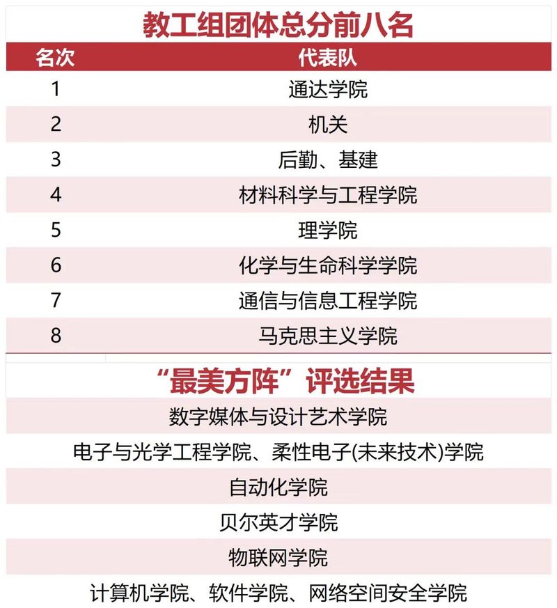 比賽精彩瞬間 10月25日下午,運(yùn)動(dòng)會(huì)落幕。材料科學(xué)與工程學(xué)院榮獲研究生男女團(tuán)體總分第一名,海外教育學(xué)院榮獲本科女子乙組團(tuán)體、本科男子乙組團(tuán)體、本科乙組男女團(tuán)體總分第一名,通達(dá)學(xué)院榮獲本科女子甲組團(tuán)體、本科男子甲組團(tuán)體總分第一名。數(shù)字媒體與設(shè)計(jì)藝術(shù)學(xué)院,電子與光學(xué)工程學(xué)院、柔性電子(未來(lái)技術(shù))學(xué)院,自動(dòng)化學(xué)院,貝爾英才學(xué)院,物聯(lián)網(wǎng)學(xué)院,計(jì)算機(jī)學(xué)院、軟件學(xué)院、網(wǎng)絡(luò)空間安全學(xué)院獲評(píng)“最美方陣”。