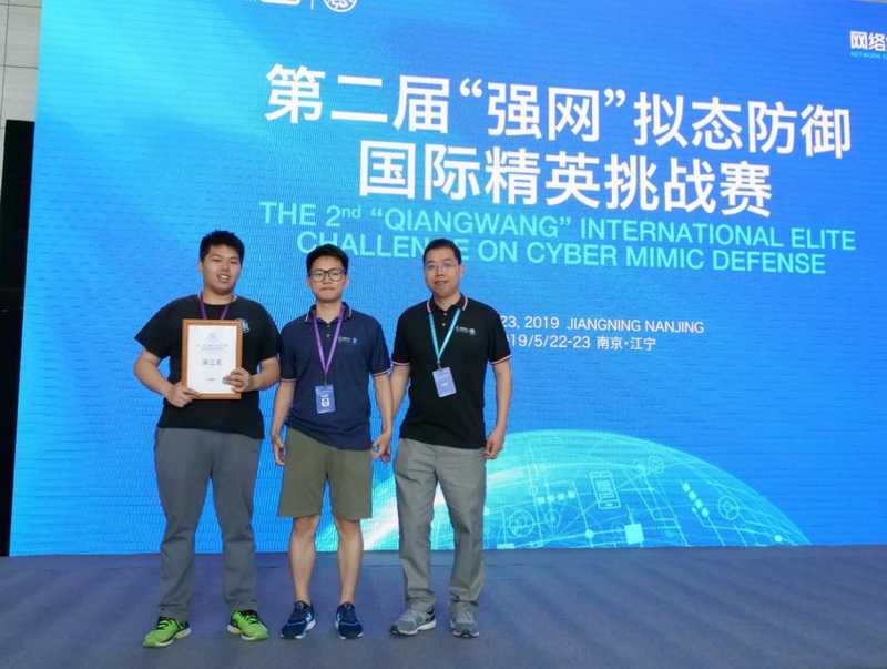 On May 22 to 23, the 2nd QiangWang International Elite Challenge on Cyber Mimic Defense was held in Nanjing. Under the guidance of our university’s Dr.Sha Letian, the third-year undergraduates majoring in information security and software engineering, Mu Haowen, Sun Xinqian and Yao Cheng represented the team and won the third place in the final with a bonus of 80,000 yuan, showing the practical combat ability of our information securitystudents.