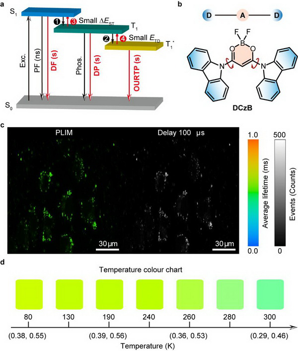 The team led by academician Huang Wei and professor Chen Runfeng proposed that with the help of reasonable molecular design, long-lived excitons can be transformed effectively and the luminous efficiency of organic afterglow can be significantly enhanced. The newly-produced afterglow materials have a lifetime of 0.23s and its efficiency of up to 45%, which is the highest reported afterglow efficiency so far. This study utilizes the newly developed afterglow materials to expand the application in phosphorescent life imaging and visual temperature detection. The developed thermal activation tri-mode afterglow material can effectively enhance the afterglow efficiency and represent an important progress in the field of highly efficient organic afterglow.