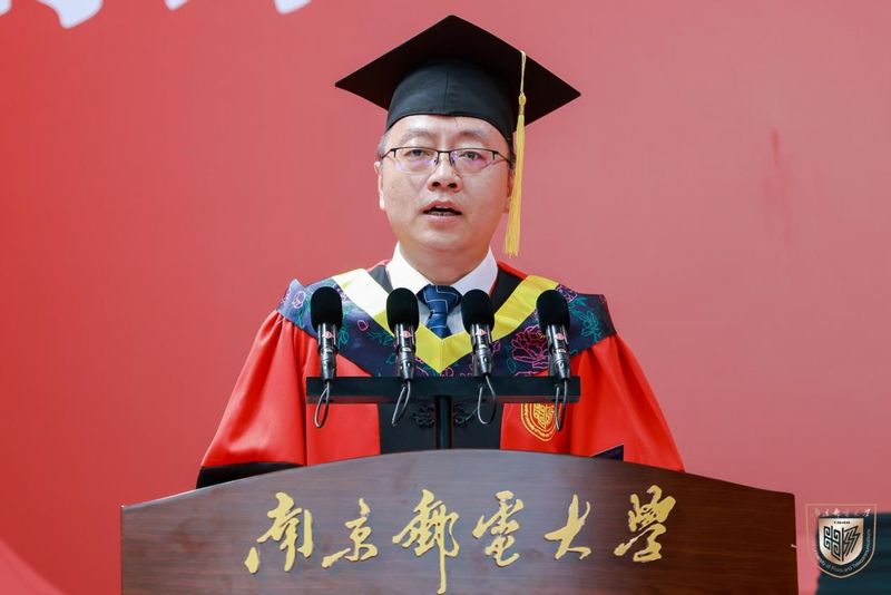 Teacher representative, Professor Ling Haifeng from the School of Materials Science and Engineering, who completed his bachelor's, master's, and doctoral studies at NJUPT, reflected on his academic journey and growth at the university. He shared three expectations for the graduates: to become transmitters of information serving the nation by aligning personal development with national progress, to uphold integrity and trustworthiness, and to practice gratitude. Today you are an NJUPT graduate, and you will always remain an NJUPT graduate, he affirmed.