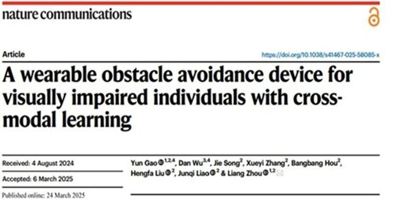 Recently, Dr. Gao Yun, a young faculty member from the Key Laboratory of Broadband Wireless Communication and Sensor Network Technology (Ministry of Education) and the School of Telecommunications and Information Engineering at Nanjing University of Posts and Telecommunications (NJUPT), has made significant research progress in the interdisciplinary field of communications, wearable technology, and artificial intelligence. The related findings, titled A Wearable Obstacle Avoidance Device for Visually Impaired Individuals with Cross-Modal Learning, has been published in the prestigious international journal Nature Communications.